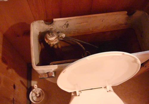 Last comes the toilet. Flushing it causes the float valve to drop, which in turn opens up the valve. With all the air shooting out into the partially emptied tank, this can cause quite a bit of splatter.