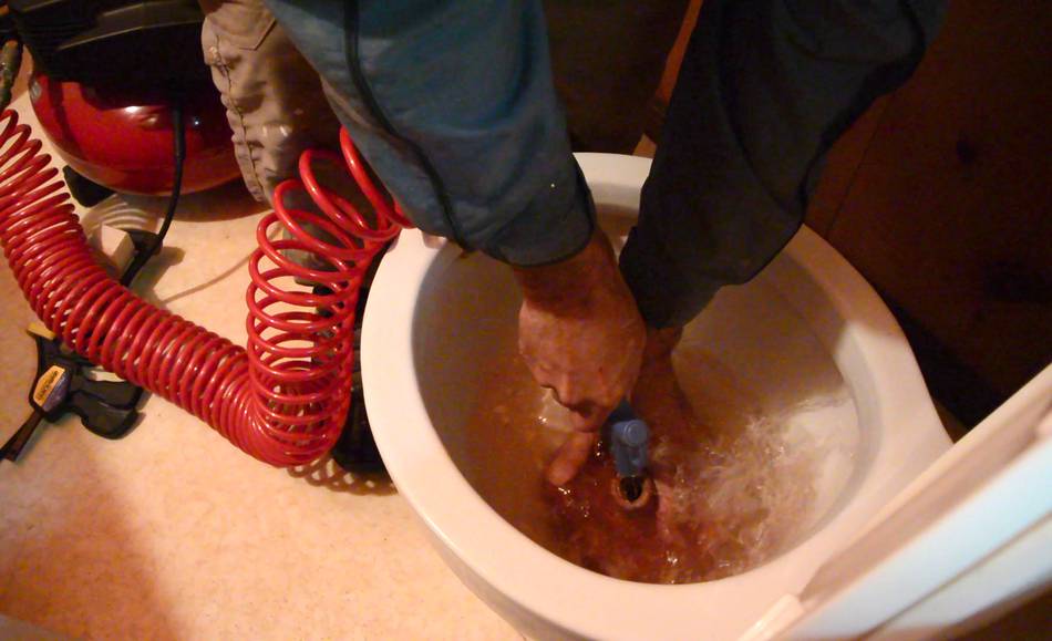 What I realized since though is, with the compressor at 100 psi, by just aiming the nozzle into the drain and letting it blow, the Venturi effect is enough to push the water back as well, emptying the toilet bowl even faster.