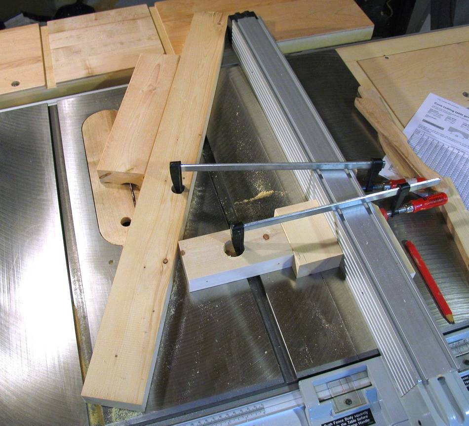 It helps to clamp your angled temporary fence to the table saw's main fence. This leaves the