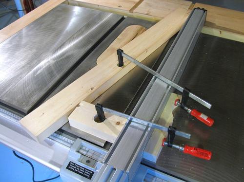 Attaching the temporary cove cutting fence to the main table saw fence is only practical