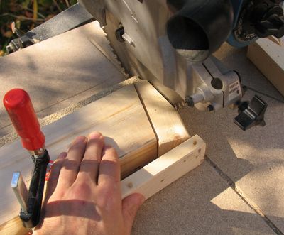 Note how I'm using two scrap pieces of wood to jig the piece in place for cutting this angle so that I don't have to get my fingers anywhere near the path of the blade. My living room window is wider than 8 ft, so had to join two 8-foot 1x2's together to span the width of it. I used a similar technique to cut the 1x2s at an angle for a scarf joint.