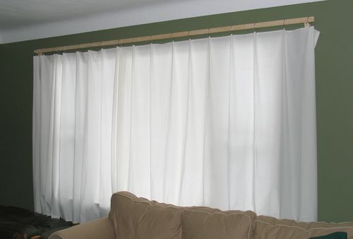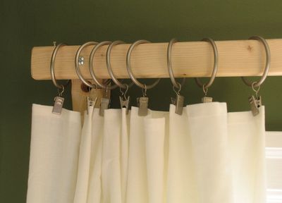 I put some coats of varnish on the wood to help the rings slide better on the wood. I used some water based floor varnish, which is very slippery. If you made the curtain rods out of hardwood, the rings would slide better even without varnish. For the curtains themselves, it turned out that bed sheets for a twin sized mattress were just the right width for my windows. I didn't really want something as opaque as regular curtains, so bed sheets were perfect. Though for the master bedroom, facing the street, I layered sheets with 300 thread count to get a bit more opacity.
