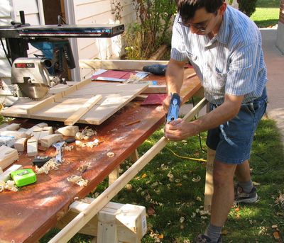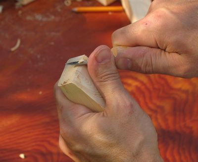 The image at right snows the portion planed away of the 1x2 as well as the curtain ring. The rounding is fairly approximate, as I just planed it by hand until it looked like it was that kind of round.