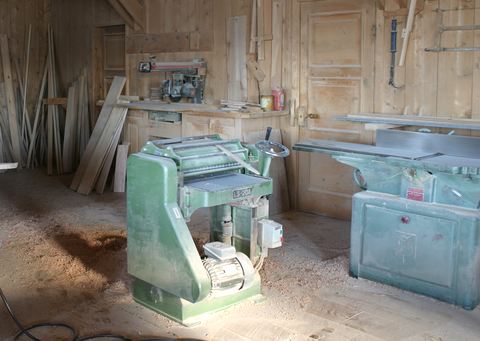 The door between the radial arm saw and the jointer goes to a room where the wood shavings go. to clean up, my dad simply opens the door and pushes the wood shavings into that room. Farmers and people with horses used to come to retrieve the shavings on occasion. But more recently, my dad has taken to just shoveling the wood shavings and sawdust straight into the woodstove.