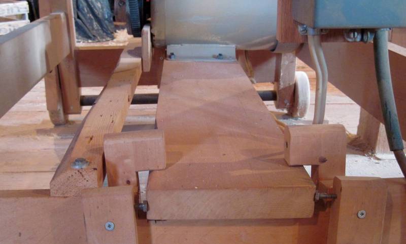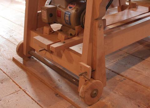 The whole saw is on wheels. Wooden wheels, of course. Galvanized steel