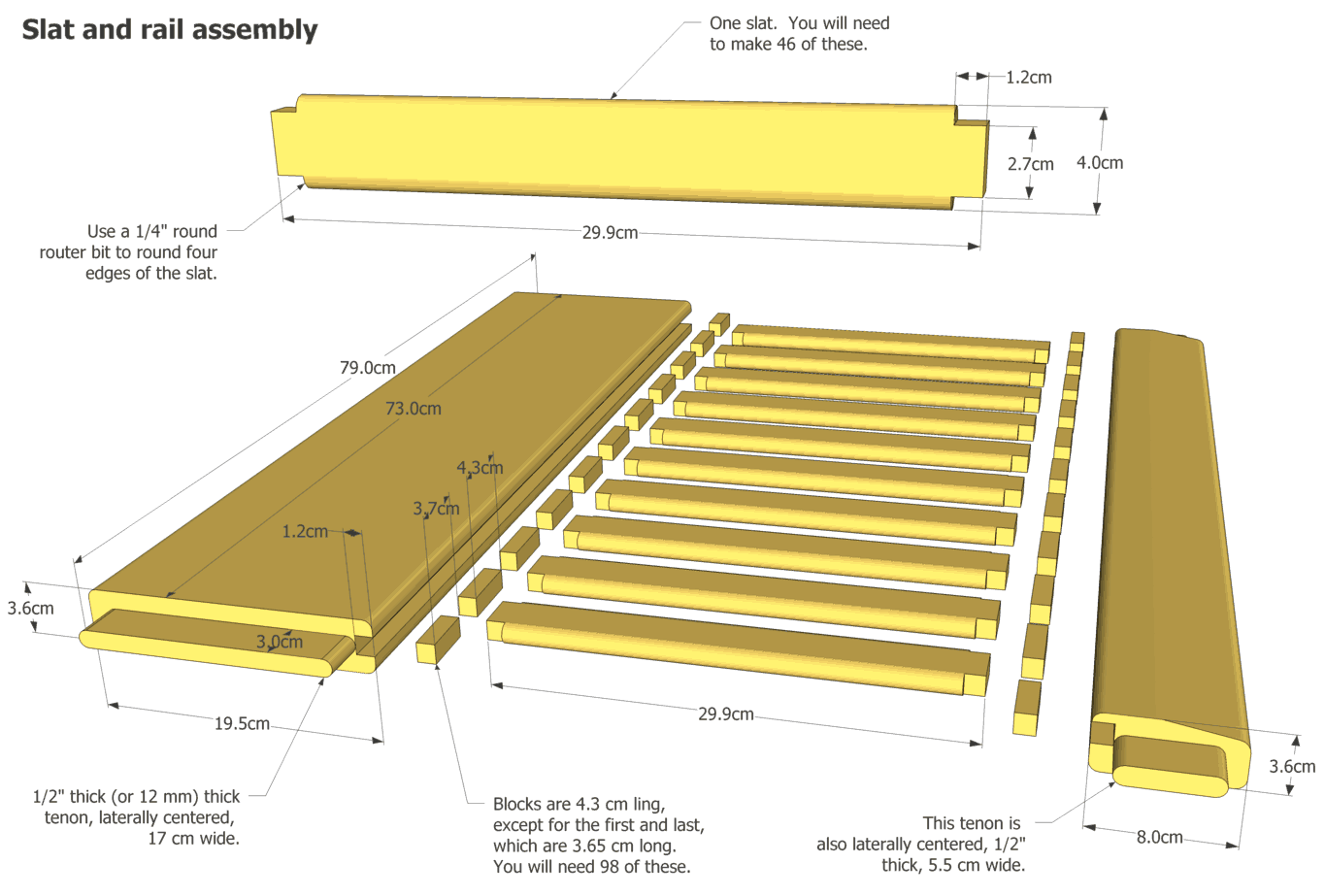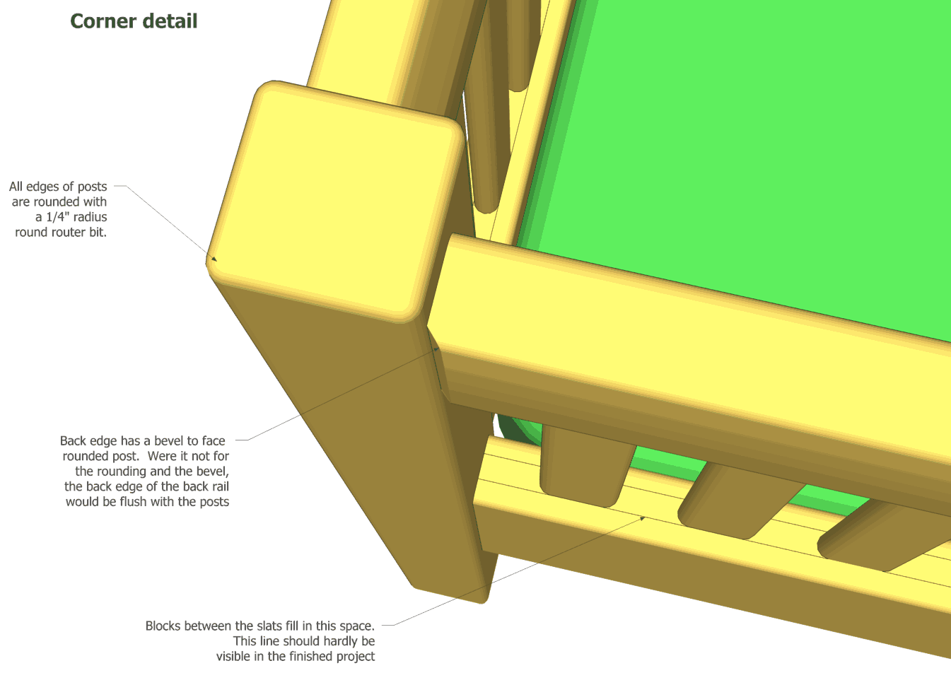 The slats are rounded with a 1/4" roundover bit on all four sides. The ends of the slats