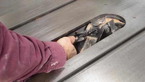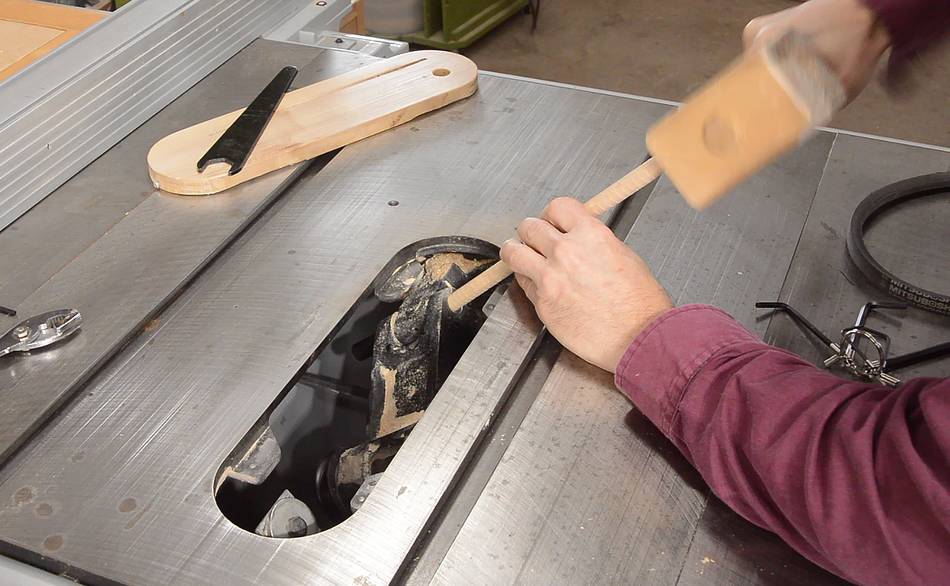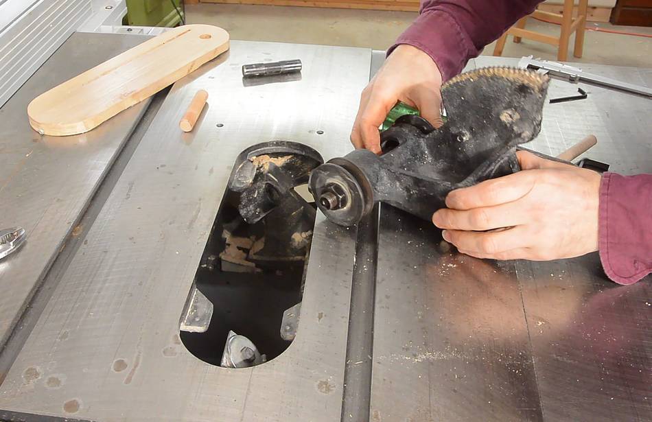I had to drive the steel pin back in from below because, even with the saw tilted
