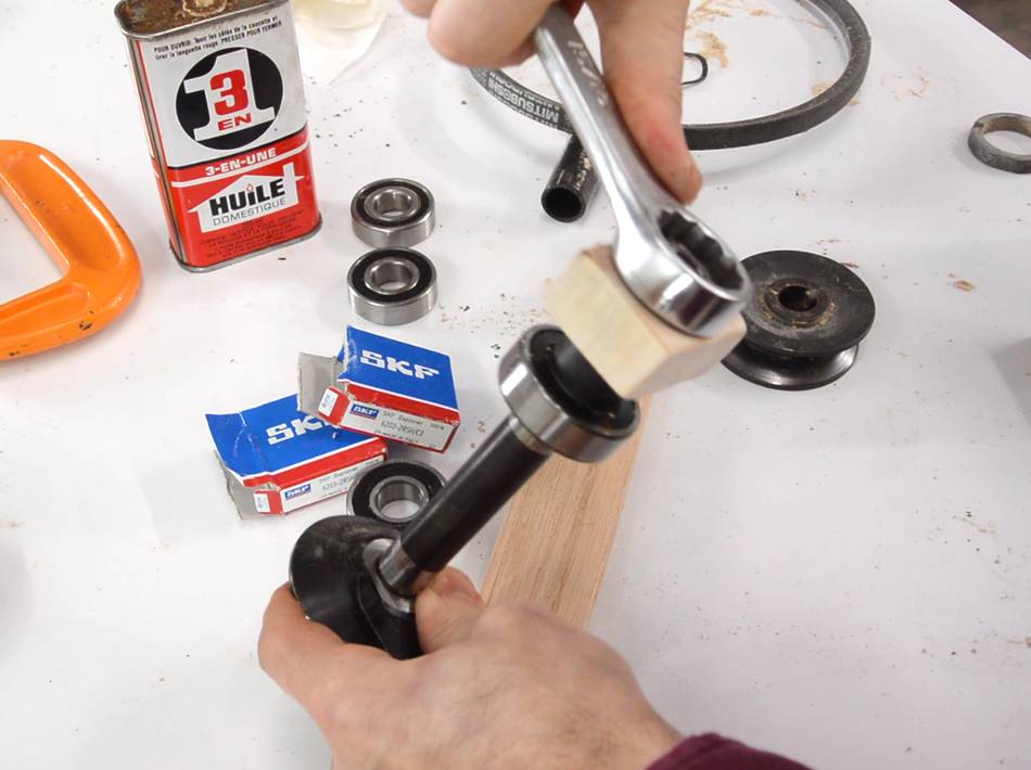Unfortunately, by pressing against the old bearing, I managed to get that one pressed in on the other side, so I had to use a thin piece of wood and a mallet to push it back out, then put the new bearing there as well.