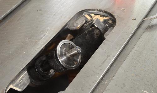 After I had the pin in, I realized I had the arbour cranked higher than the upper stop (maximum depth of cut) stop, and now I could not lower it because of that stop. Oops! But the stop is actually a screw, which I was able to remove to lower the arbour. More on that stop.