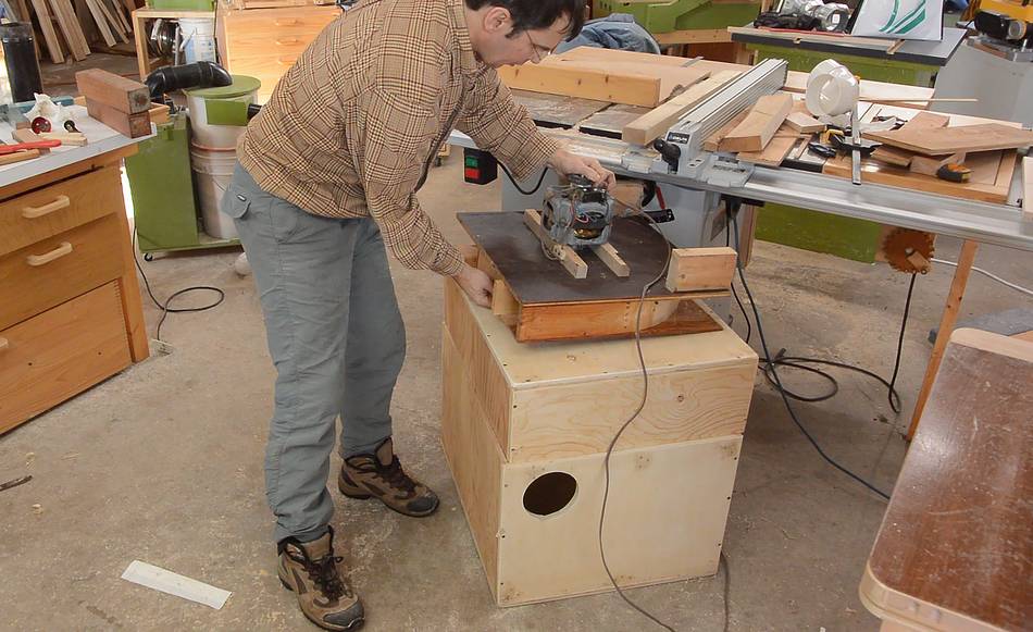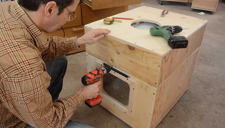 It was tempting to add weather stripping to help seal the blower against the case, but that would have added another 4 mm to the height of the dust collector, and the height was already within a few millimeters of the table saw table.