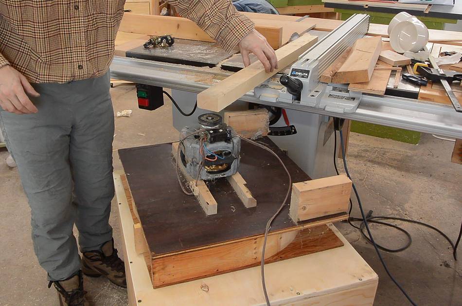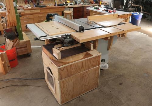 And here it is behind the table saw. I usually use my homemade tablesaw as an outfeed table.I also made a relay box to automatically start this dust collector when I turned on the table saw. I couldn't just wire it directly into the main switch of the saw because the blower runs on 120 volts but the saw runs on 240 volts.