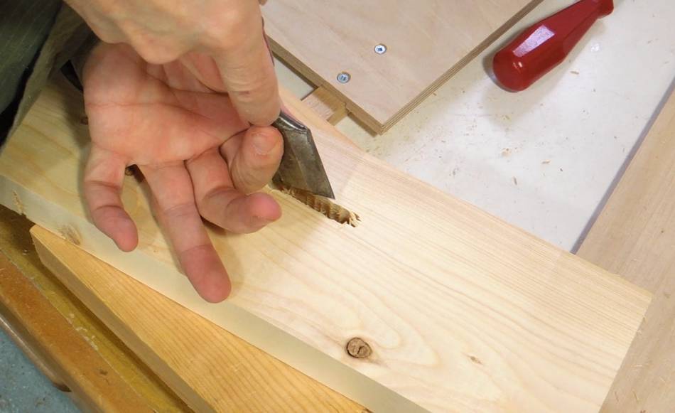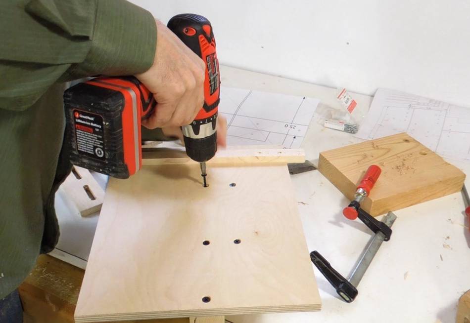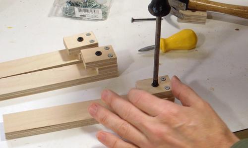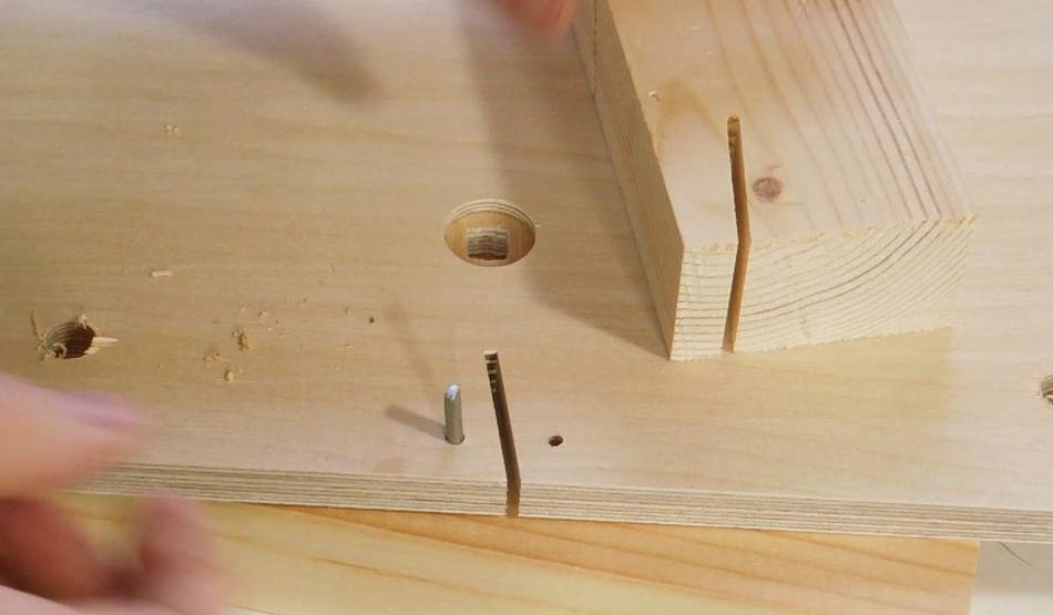 I made a wooden knob for this pin from two layers of the 11 mm birch plywood. I pre-drilled slightly undersized holes in the plywood, slightly tapered the shaft, and pounded it into the wood.