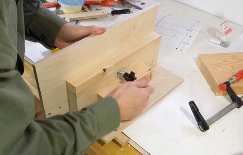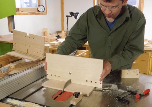 This makes the jig safer to use. It also prevents me from cutting too far into the jig. As such, the blade never comes out the back of the jig, which has a further advantage of ensuring that the sawdust has to follow the saw's kerf down into the saw table. The block is held in place with a T-nut, similar to how my featherboard is held down. A plastic knob locks the block in place. If you don't know where to find one of these plastic knobs, you can also make one, like I did here