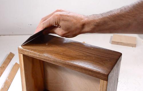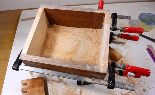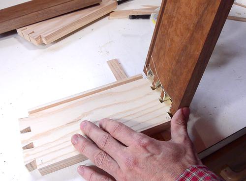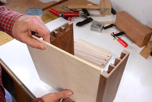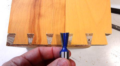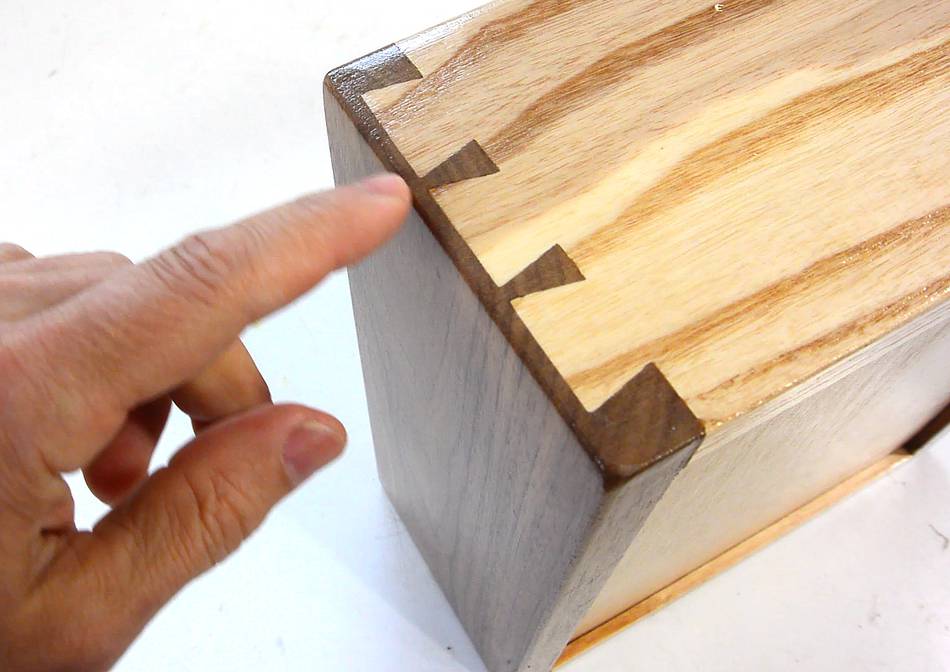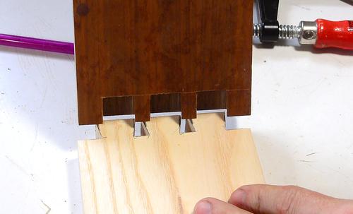 Even though I cheated, these joints were still a lot more work than box joints. With a box jointed box, I would have put about 10 fingers in the space where I have three tails, so I'd have a lot more glue surface. That in turn makes a box joint relatively stronger, so I could have used thinner material and still have the box hold together against abuse.