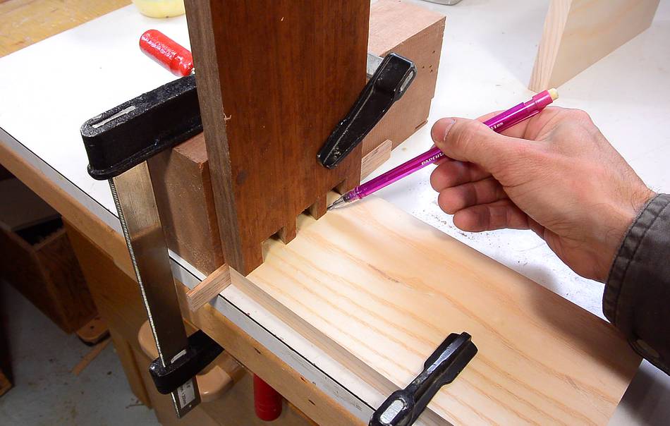 I ended up slipping with the workpiece the first time I transferred the dimensions, so I jigged up the pieces with clamps. The tails board needs to go as far as the ends of the cuts on the pin board are deep. I made a spacer to help position these (you can see the end of this spacer sticking out to the left)