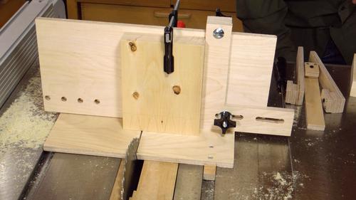 Finished joints, and the two jigs, plus the extra backer board at left.