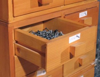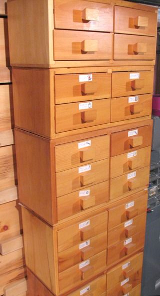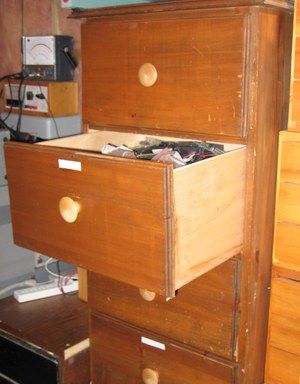 I don't think I'd take the time to make so many drawers again (the shots above show just some of them), but when I was still in high school, I had little money and lots of time. And the wooden drawers do hold up to time better than plastic ones would.