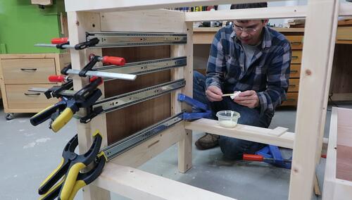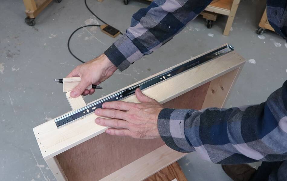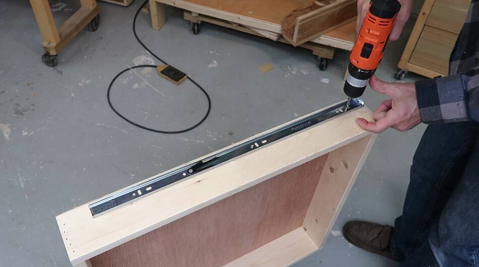 Then attaching the drawer slides. I mounted the inner part so that the outer part