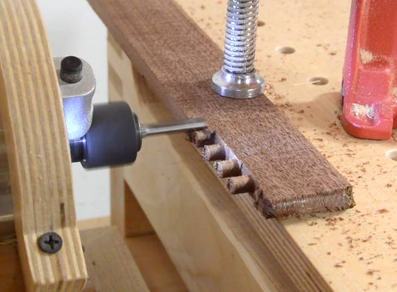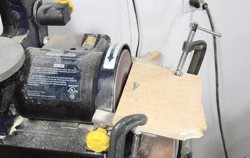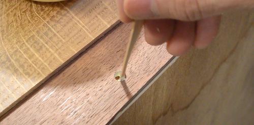 A scrap of wood with a 1/4" hole helps guide the drill. The point