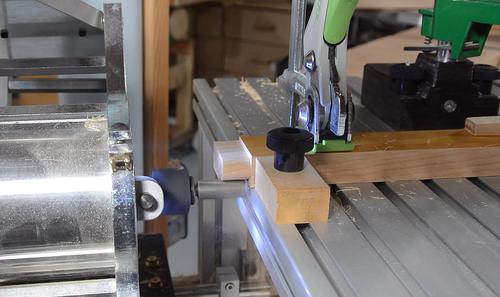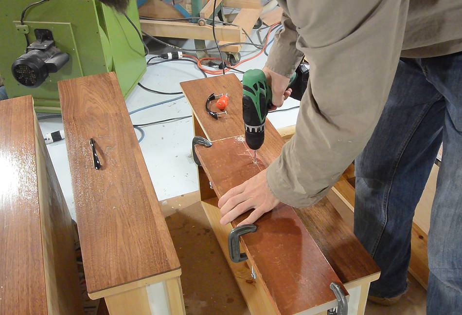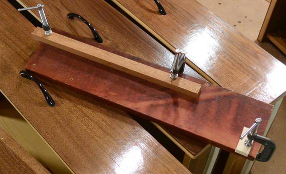 I rigged up a temporary jig to drill the holes. Just two holes at the right spacing in a piece of hardwood, with some blocks clamped to the underside of the board to help position it on the front of each drawer. Once the seven drawers are drilled, the temporary "jig" goes back in the scrap bin.