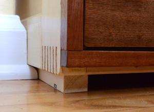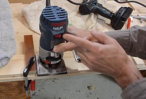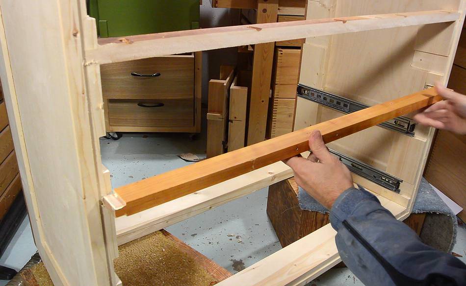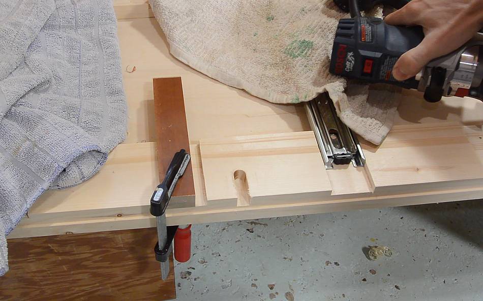 But with this dresser as tall as it is, I was afraid that the sides might bow in or out over time. So I added one horizontal rail on the front, and three horizontal rails in the back. I started by cutting open-ended mortises for these with a small router.