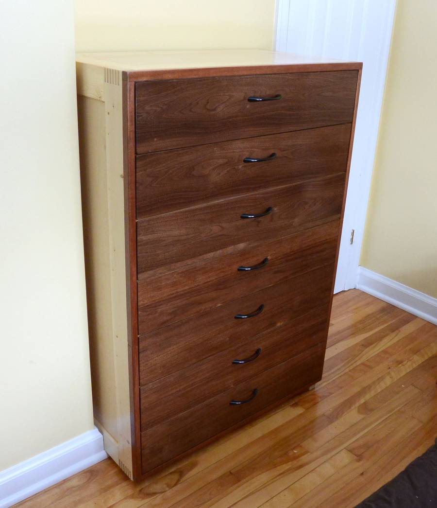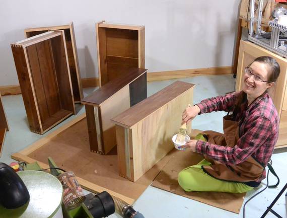 Because this dresser is for holding Rachel's stuff, I figured it's only fair to get her to do the varnishing :) It's the usual, three or four coats of Varathane Diamond floor varnish. Luckily, much of the wood for the drawers was already varnished from whichever furniture it came from.