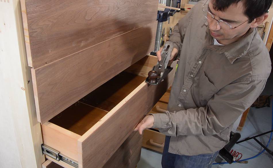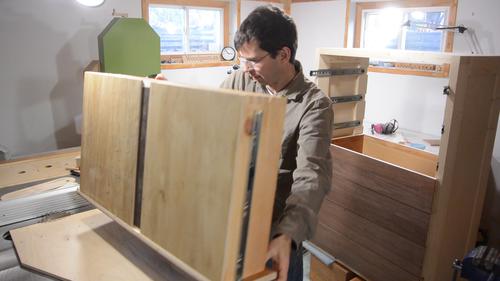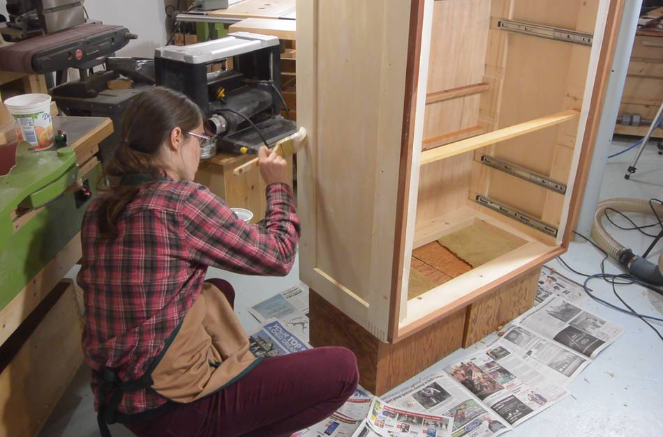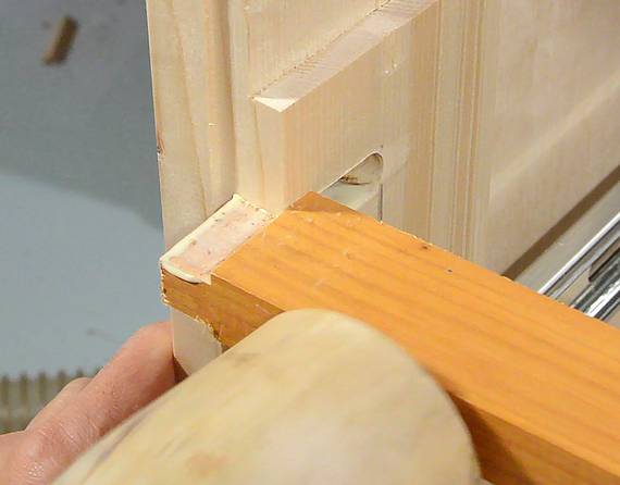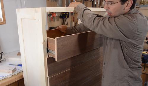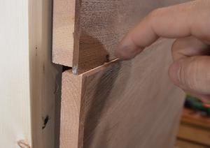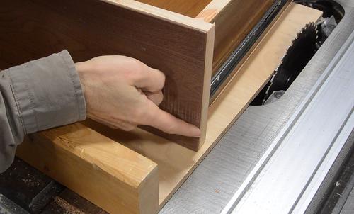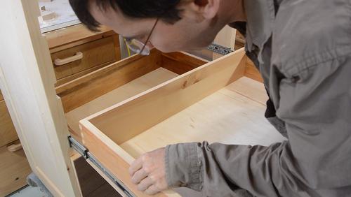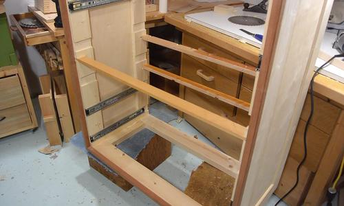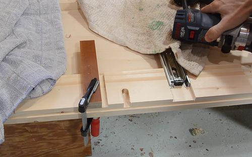 Only problem was, the drawers were too tight between the slides. I hadn't cut the dadoes deep enough, so I had to rout them out a bit more with a hand-held router. I re-routed them not quite to the dado's edges, then used a knife and chisel to cut them to the corners.