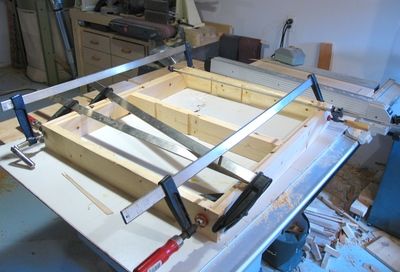 This photo shows the glue drying on the joints for the front-back connecting pieces to the