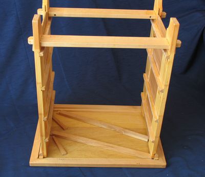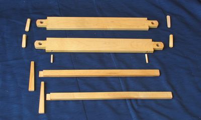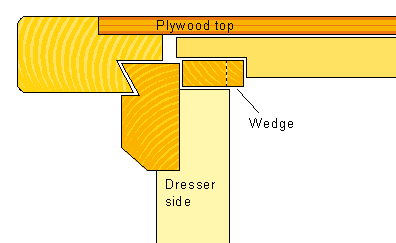 The wedges themselves are wedges cut from pieces of 3/4" dowel. The wedges slide into holes of the same diameter in the cross pieces. The holes are angled at the same angle as the wedge, so that the round part of the dowel wedge is against the hole, and the flat part against the side of the dresser.