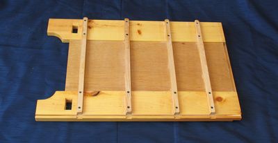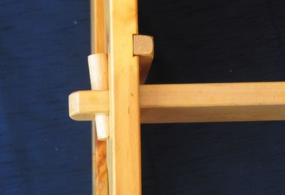 The dresser's back is a piece of 6 mm underlay plywood. It is held in with two pegs near the bottom. It slides in grooves in the side pieces, and buts up against the dresser's top. Being wedged in like that gives the back of the dresser some rigidity.