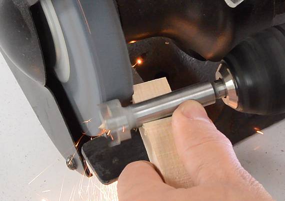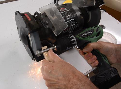 Then I held this up to my bench grinder, with the piece of wood pressed down on the tool rest to help steady it. With the drill spinning, I slowly pushed it against the wheel, then moved the drill forward and back to grind the sides of the Forstner bit in an even cylindrical manner.