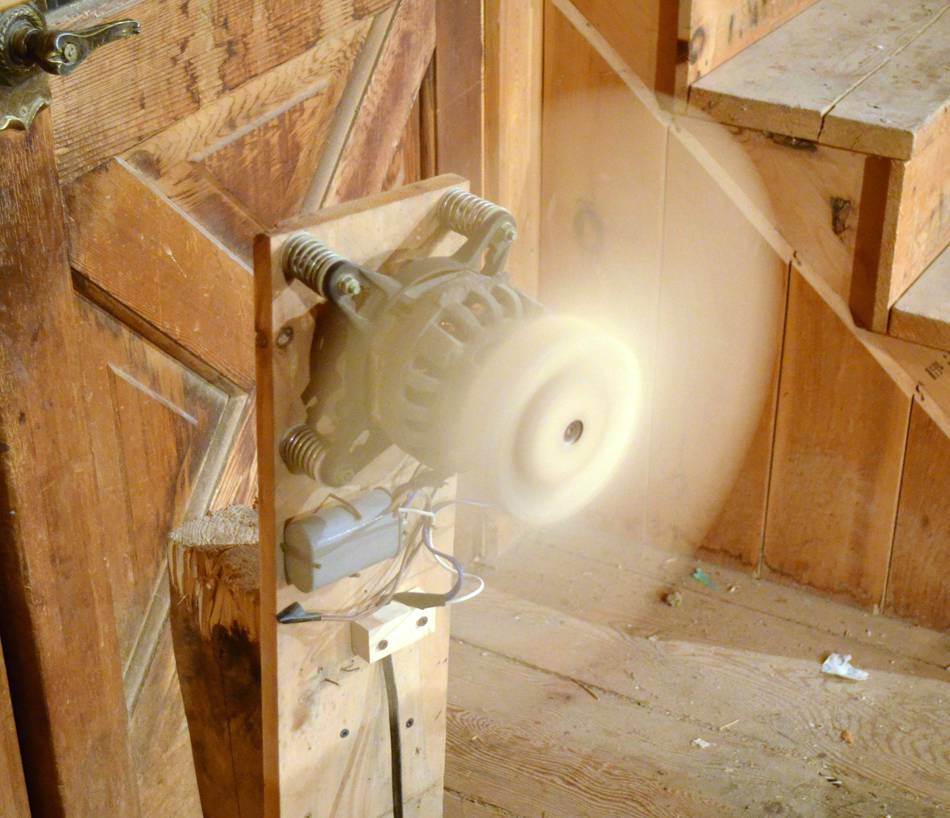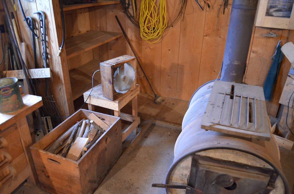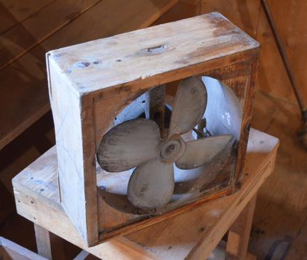 the attic and used it to blow air at the workshop wood stove. This helped get
