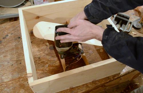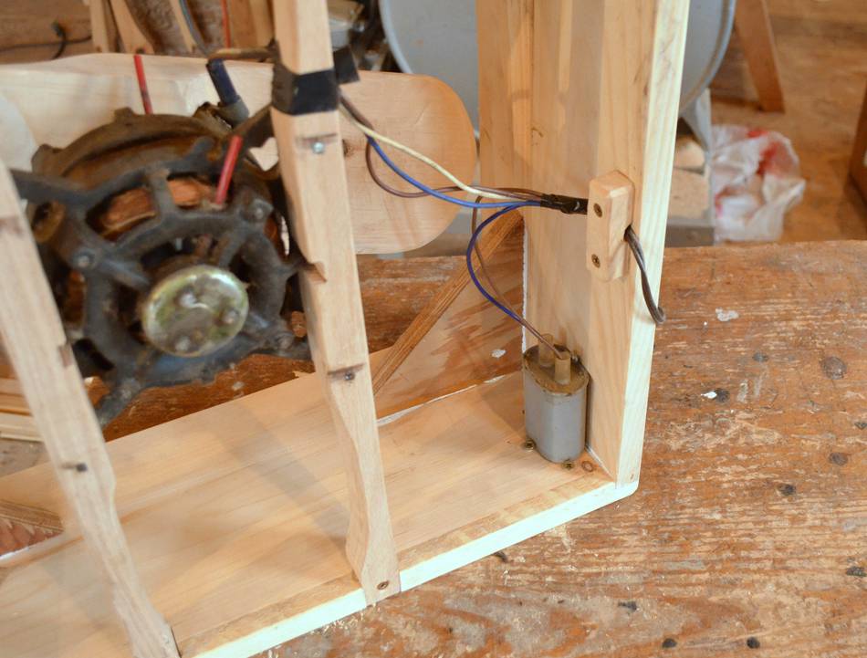 Screwing the motor onto the hardwood rods, using an old drill.