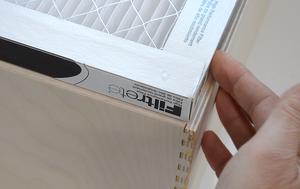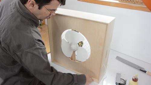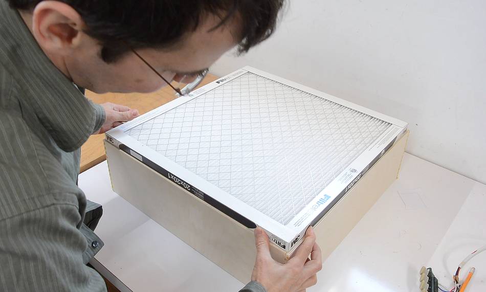 You can also make an air cleaner just by strapping a filter to the back of a box fan, but box fans lack internal baffles to stop air back-flow, which means if the filter provides any resistance to air flow, much of the air blown out the front of the box fan is actually air that has bwwn sucked in from the front. So building a fan box like this is a more elegant solution.