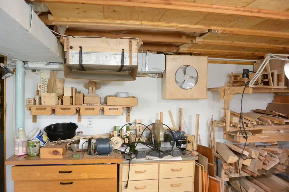 You can see my other air cleaner, this "dresser" on which are my miter saw, my lathe, partly disassembled. On the wall is my shelf with drawers, on which are some older small projects like cube, impossible joint and screw jack. On the right on the shelf behind the lamp is my router pantograph, and lower down my screw advance box joint jig, and below that lots of firewood lumber.