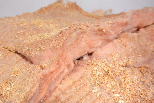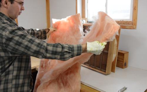 I figured, fiberglass insulation might work, even though fiberglass itself is actually quite dusty when you work with it. At right, airborne fiberglass particles in the sun, after shaking a piece of insulation.
