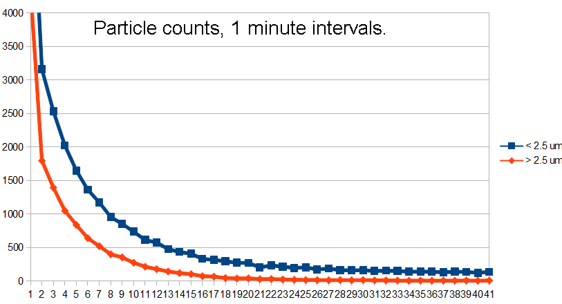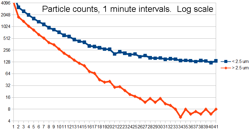 The slope for the fine particles is a bit lower. I suspect the fiberglass only catches a certain fraction of the finest particles on the way through, so the decay time constant for these is a bit longer. Overall, this unit is slightly more effective at cleaning the air than my furnace filter based air cleaner, but it's also much louder and uses more power.