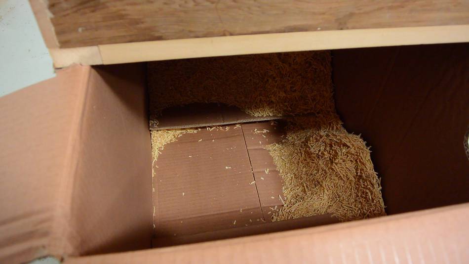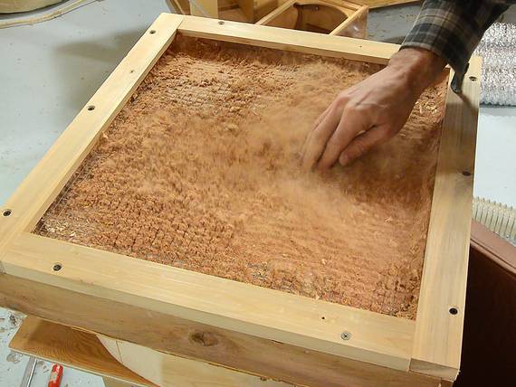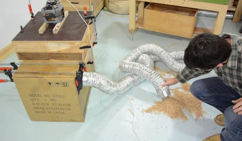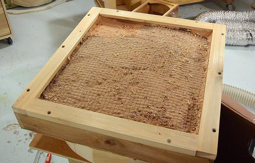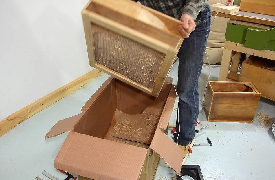 A box more vertically oriented, so that the shavings can drop further from the inlet and fan would probably be better.