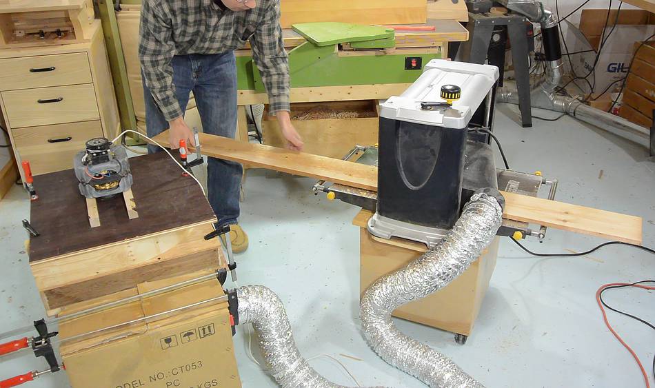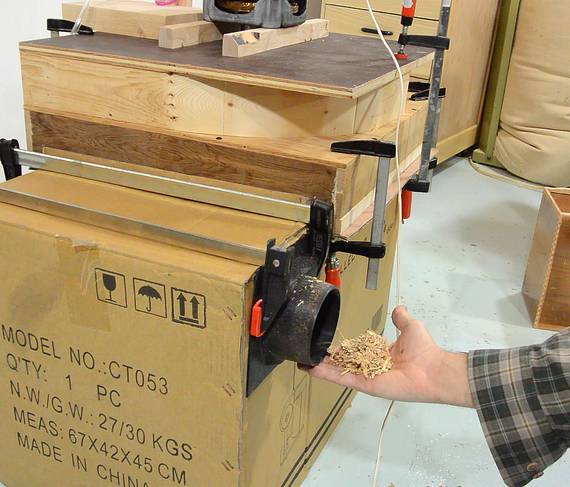 Even with the hose disconnected, airflow was by now much reduced. At right, I'm holding planer shavings in my hand, and I was able to get this close before they got sucked into the inlet.