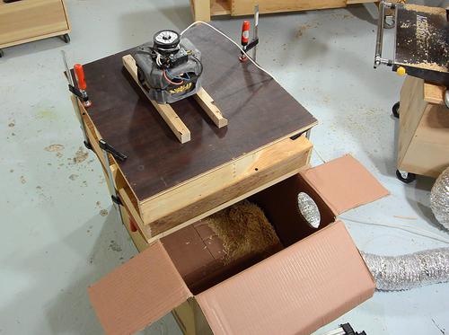 The blower only provides about half as much suction as would be needed for a proper dust collector, but I figured, no harm in trying. So I mounted the blower over a cardboard box. That box, ironically, is from another dust collector It's all a very temporary experiment. I borrowed the hose flange from my other dust collector to make a hose hookup.