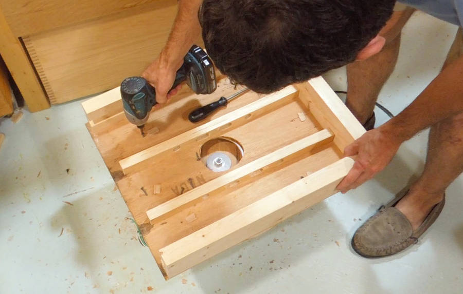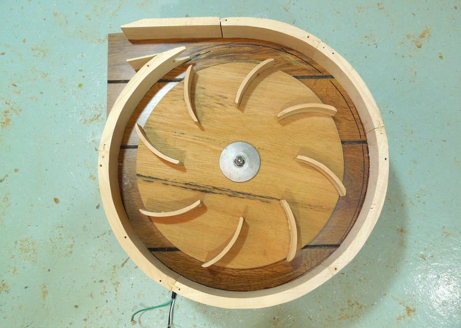 I tried the impeller, as shown, but the centrifugal force caused the plywood backer to bend a little, and the impeller rubbed against the housing before it got up to full speed.