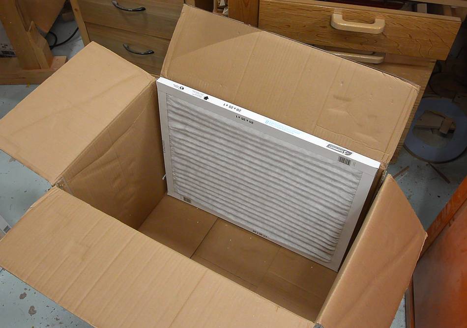 A hole cut into the top of the box allows the blower to suck air out.