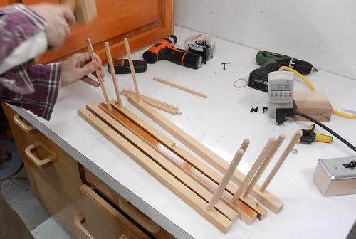 I sanded the ends of some pieces of wood round and pounded them into angled holes on bigger pieces of wood.