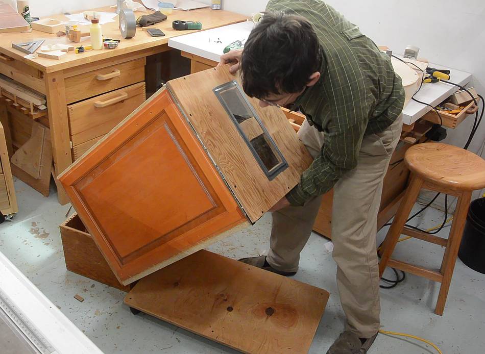 Tipping the box onto a dolly. With the hardwood side panels and particle board