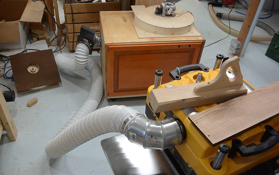I figured a rather overloading test for this set-up was to hook it up to my Dewalt 735 thickness planer. The blower on this planer blows so much air out that it overwhelms a lot of dust collectors.