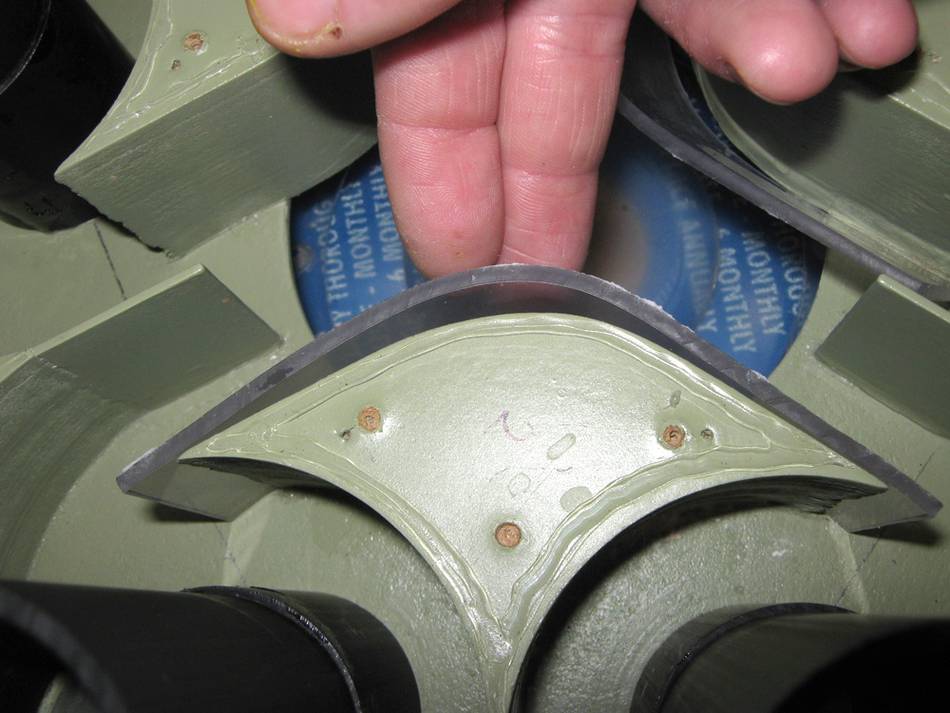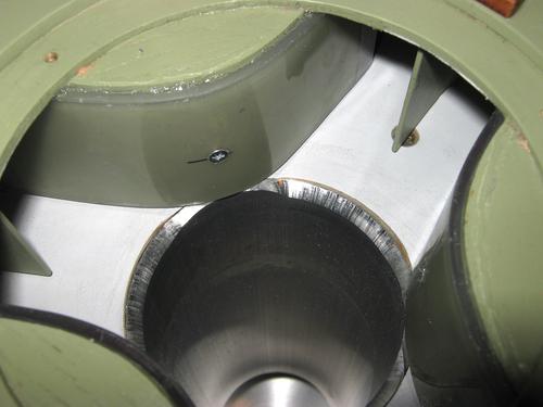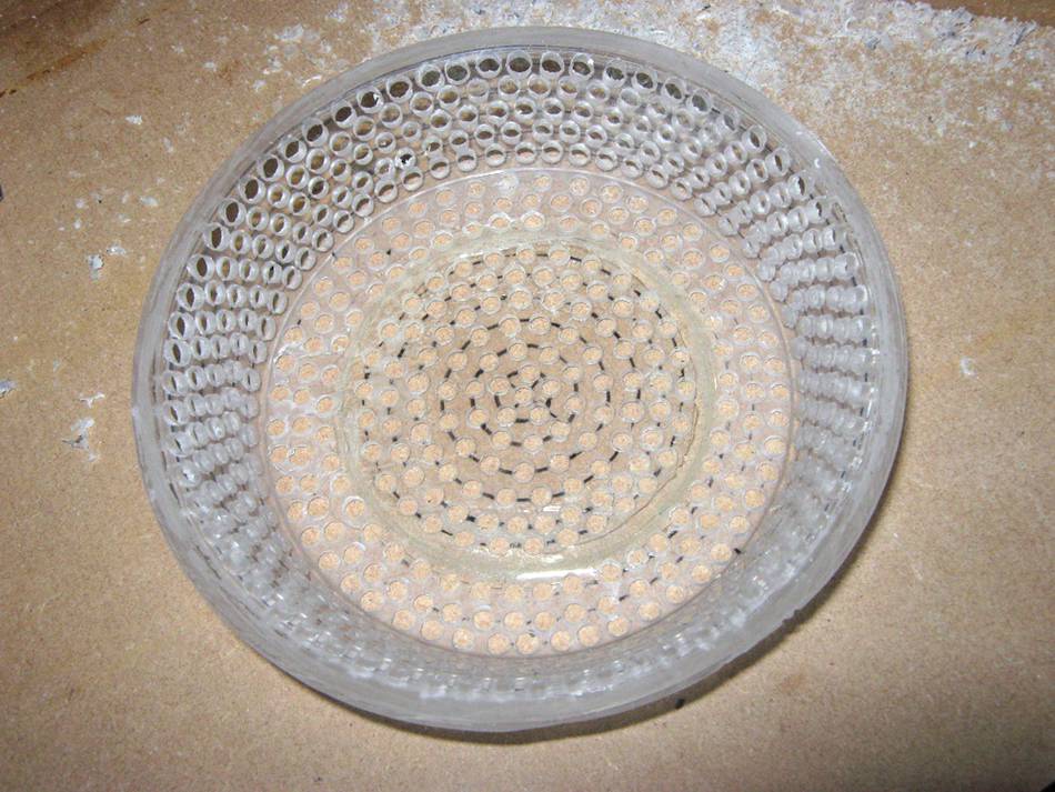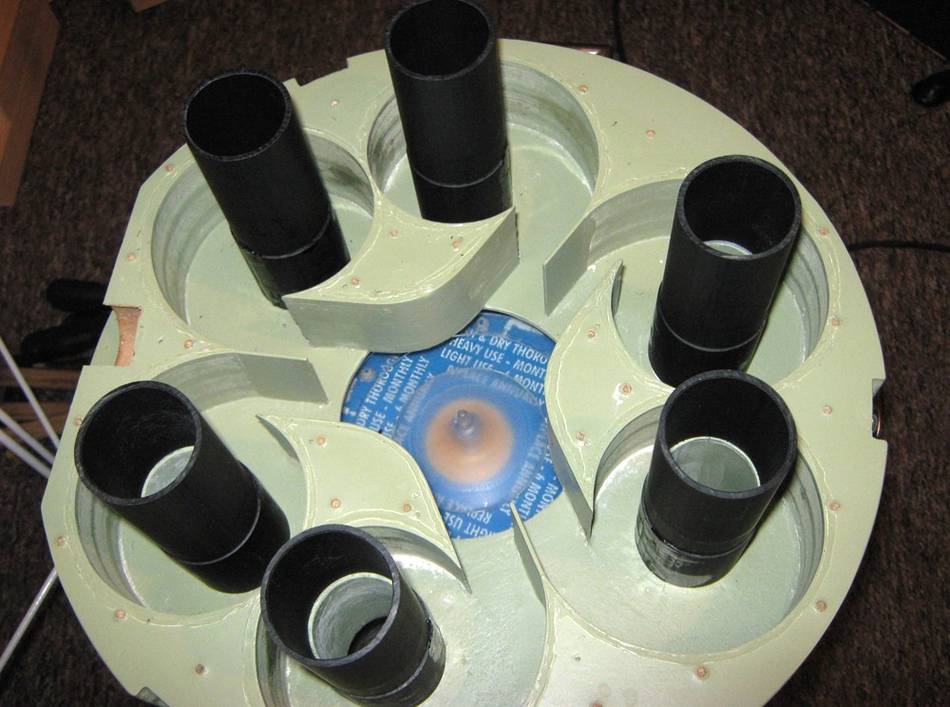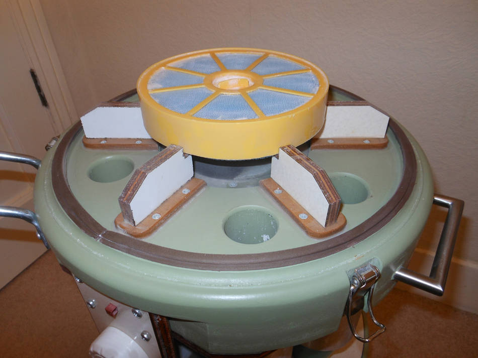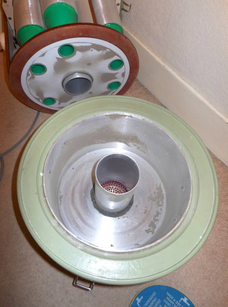This perforated bowl screens out large particles before the six cyclones above.