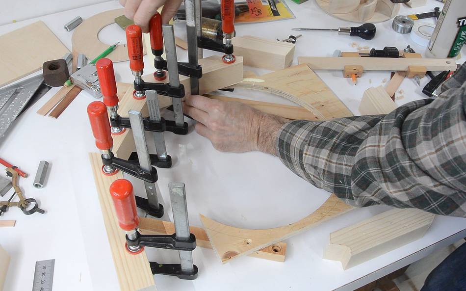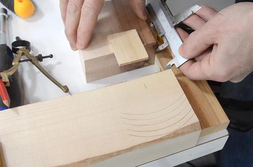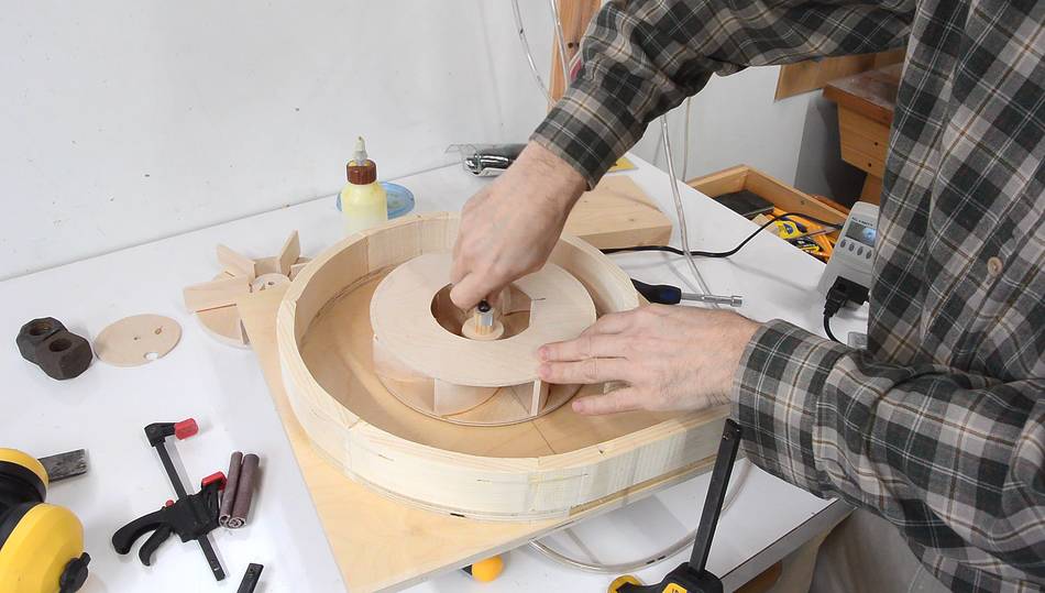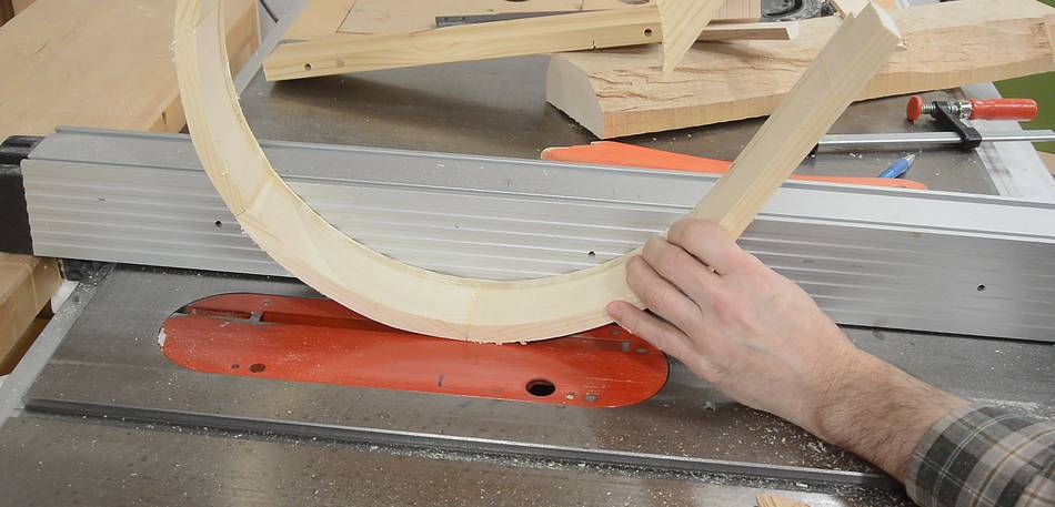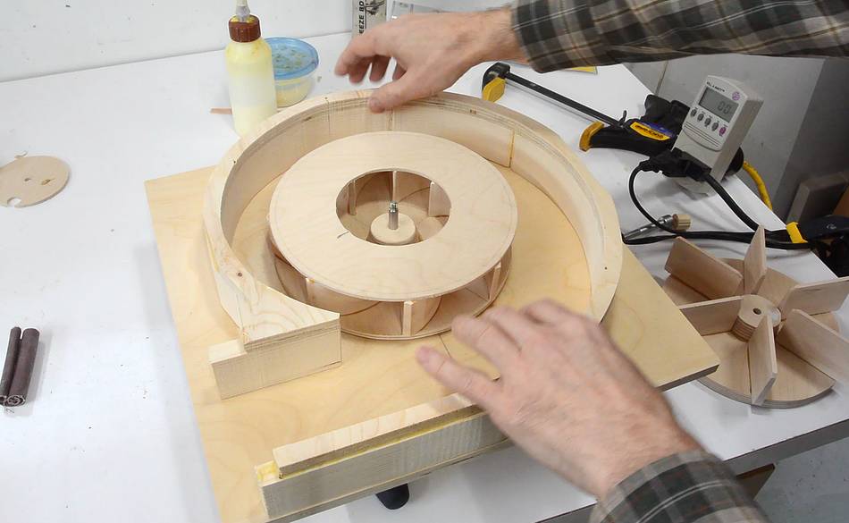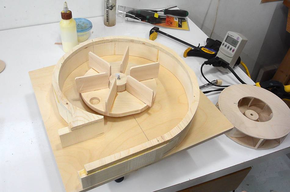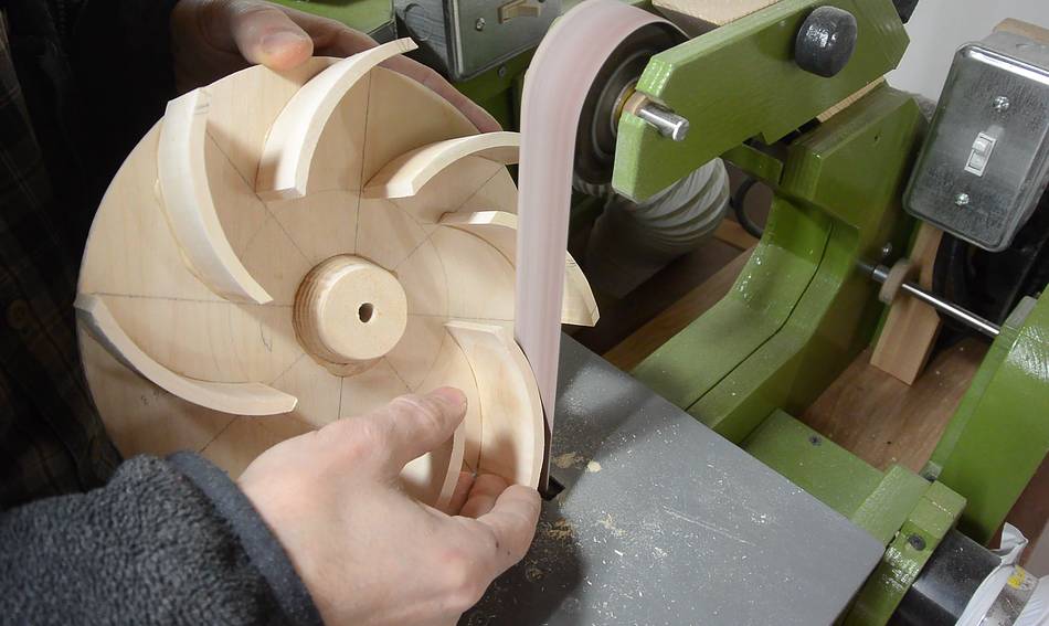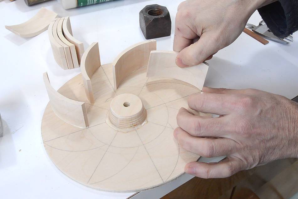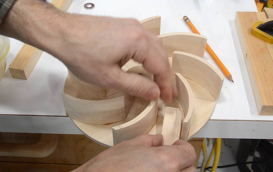 The curved vanes are cut from a solid piece of silver maple. I drew a series of equally
