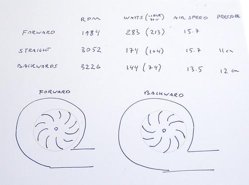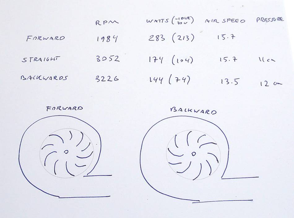 The forward facing impeller used dramatically more power (283 watts, or 213 watts more than