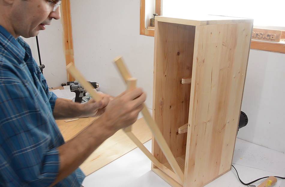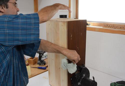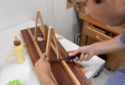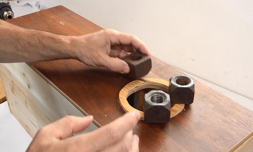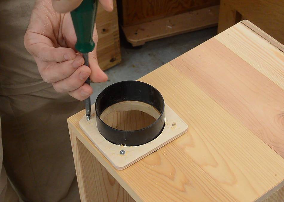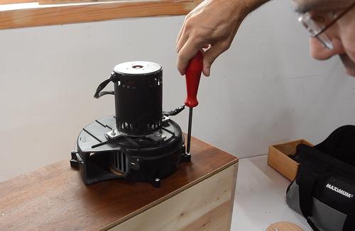 Then screwing the blower onto the box. I first placed it on, used an awl