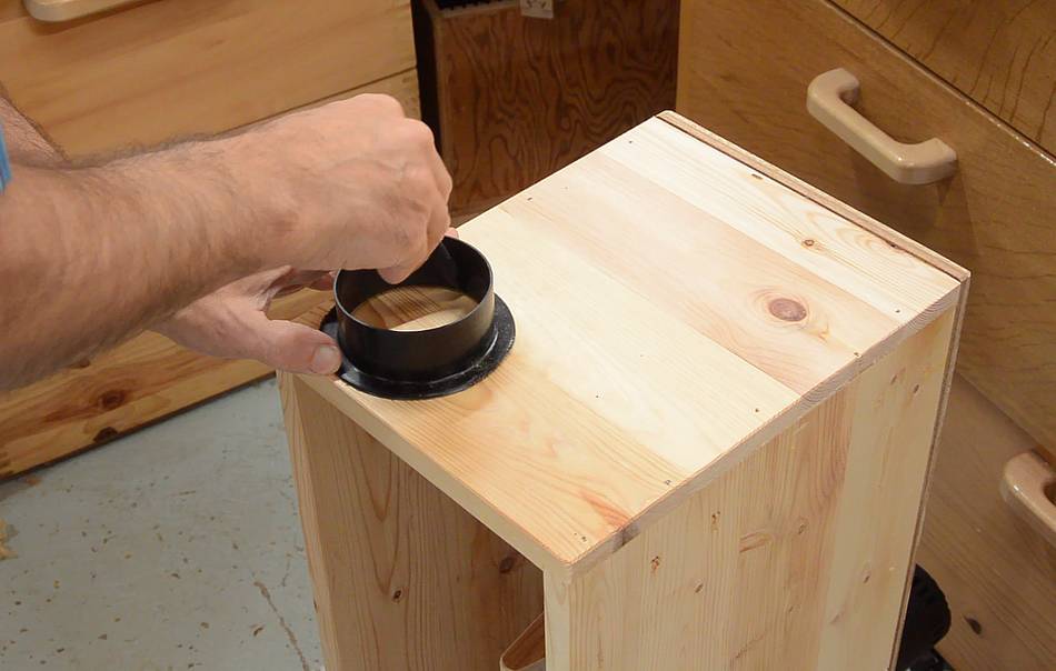 The hose port is made of a cheap 4" to 3" plastic dryer hose adapter.
